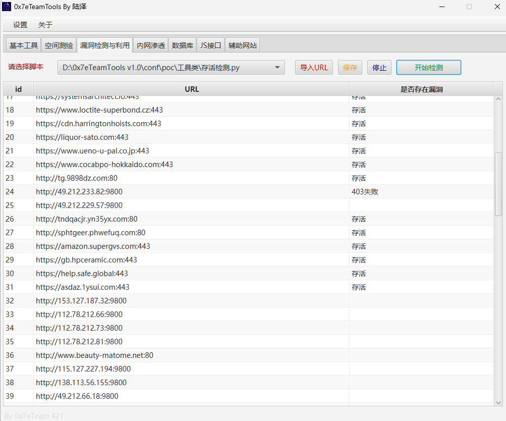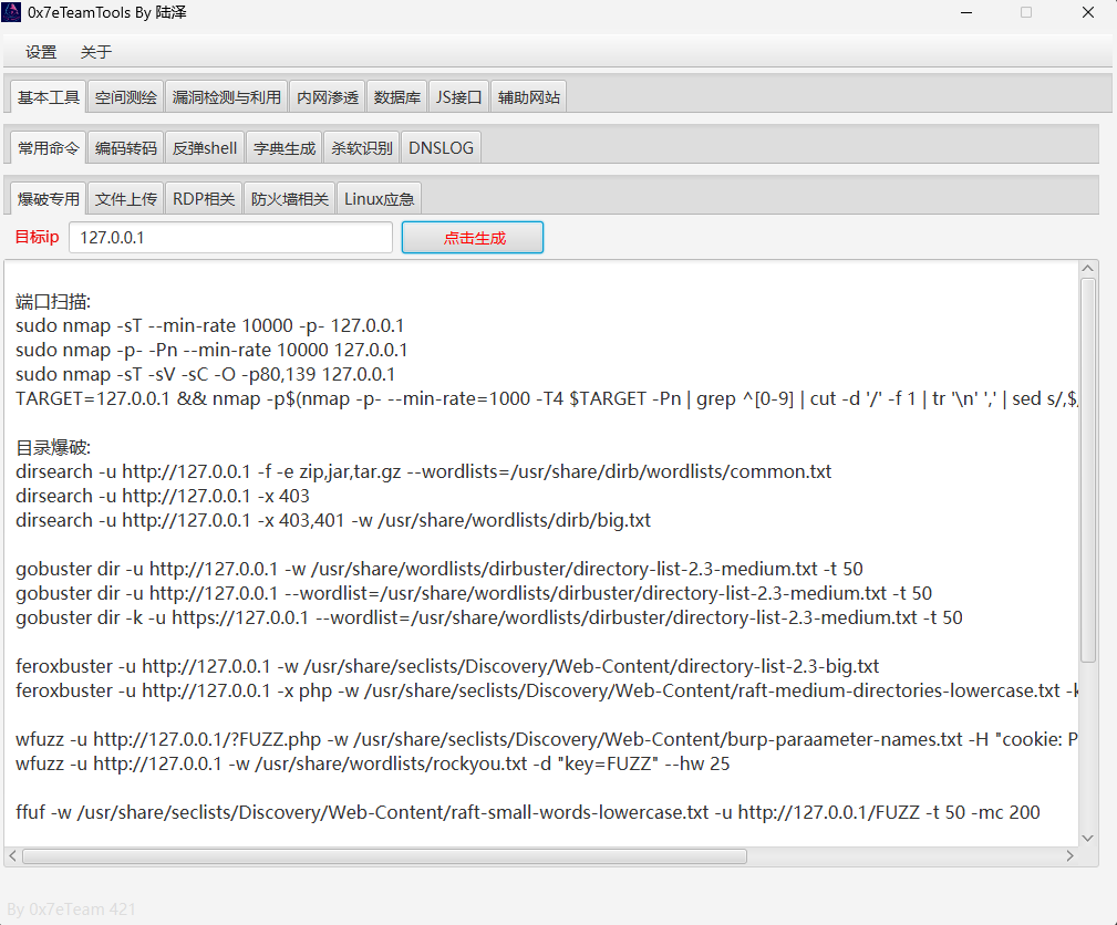 ## 更新记录 0x7eTeamTools v1.2 2024年1月24日 1、bug修复 2、修复了接口爬取但是响应码为404 0x7eTeamTools V1.1 2024年1月17日 开源 2024年1月12日 1、修复了反弹shell命令生成功能bug 2、修复了某些页面鼠标滚轮功能bug 3、新增了js接口的一些处理逻辑 3.1针对型如../xx.js、./xx.js、//xx.js等js爬取做了修复 3.2针对型如../func、./func、/func等接口处理做了修复  ## 一、软件介绍 该工具就是作者练习javafx的产物,并没有高深莫测的功能,给自己的礼物。 基本内容 设置 代理-----推荐socks API配置 基本工具 常用命令(爆破、文件上传、RDP相关、防火墙相关、Linux应急) 编码转换(Base64、Unicode、url编码、字符串反转、ASCII、rot13、摩斯) 反弹shell 字典生成 杀软识别 DNSLOG(命令执行场景、SQL注入场景、XXE场景、其余中间件场景) 空间测绘 FoFa 鹰图 Quake360 漏洞检测与利用 调用py脚本,可以导入url,也可以从空间测绘send过来 内网渗透 横向移动(impacket-0.11.0的聚合) PTT 密码喷洒 数据库 MYSQL ORACLE JS接口 实现从网址导出js,从js导出接口,接口的存活探测 辅助网站 一些常用的渗透辅助站点收集 ## 二、软件使用 其余功能比较简单,只介绍漏洞检测和JS接口 ### 漏洞检测 第一步:先配置各种API  第二步:选择一个空间测绘  第三步:选择自己的脚本,检测即可 脚本编写要求【可以参考模板】 1、要求只从控制台获取一个参数,内容是url 2、检测的结果请输出之控制台 3、代理需要自己加到py里面  ### 内网横向 py调用的`impacket-0.11.0`   ### JS接口 第一步:输入网址 获取js  第二步,挑选一个感觉有接口的js 这里的js不能有参数  第三步:(可选),观察结果,如果有特定的目录,可以添加在前面 第四步:选择请求方式,然后点击`获取接口状态`即可  结果  有建议和需求可提 ISSUE
