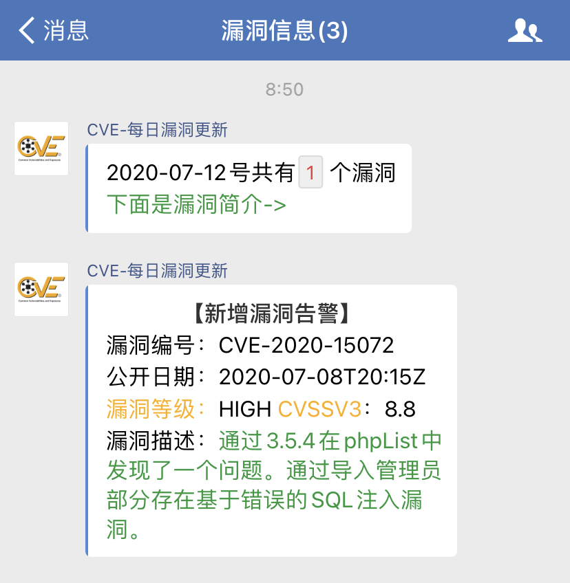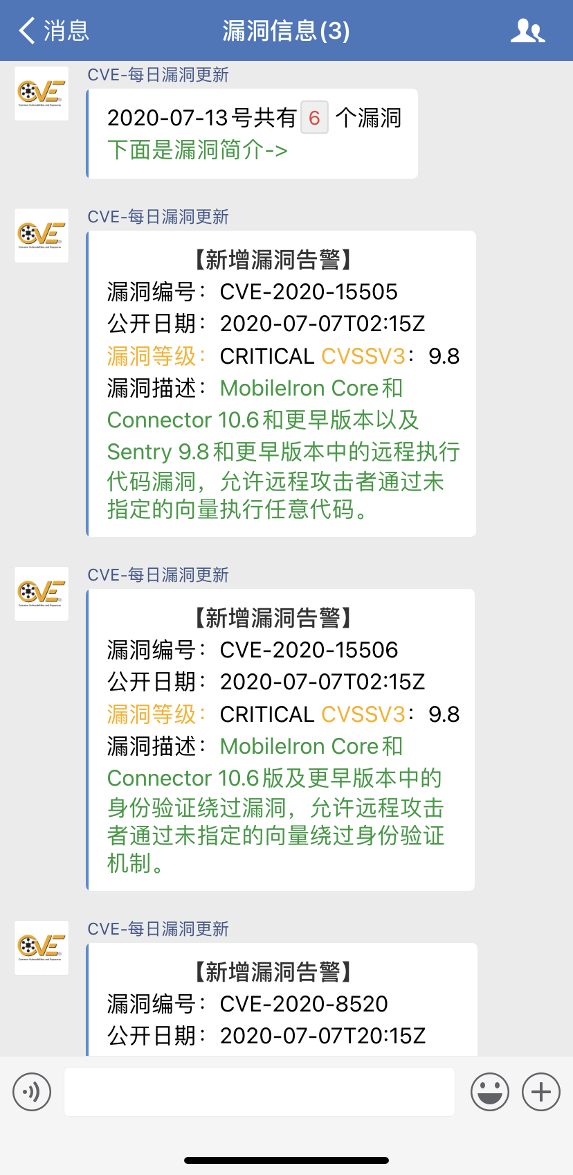 该脚本用于获取最新的CVE漏洞信息,通过企业微信的接口每日推送