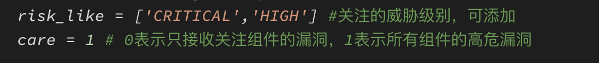 2、只推送自己感兴趣的漏洞级别,通过更改risk_like和care参数