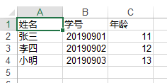 <p>f = xlwt.Workbook()<br>sheet1 = f.add_sheet(‘sheet1’,cell_overwrite_ok=True)<br>column = [“姓名”,”学号”,”年龄”]<br>name = [“张三”,”李四”,”小明”]</p>