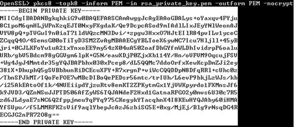 2)把RSA私钥转换成PKCS8格式 输入命令:pkcs8 -topk8 -inform PEM -in rsa_private_key.pem -outform PEM -nocrypt,并回车当前界面中会直接显示出生成结果,这个结果就是PKCS8格式的私钥,如下图: