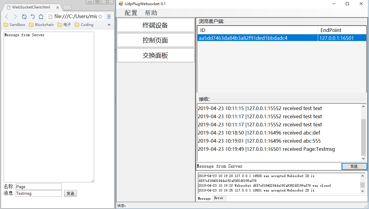启动方法:在本地windows环境下运行.\UdpPlugWebsocket\bin\Debug\UdpPlugWebsocket.exe即可按照config.xml中描述的端口启动服务程序。默认UDP端口为7101,Websocket端口为9000。此时外部的UDP连接和Websocket连接都会在UI中显示。其中UDP在终端设备页面中显示,Websocket连接在控制页面中显示,通讯状况在交换面板页面中显示。您可以通过配置->显示调试系信息 打开或关闭UI的通讯Log。