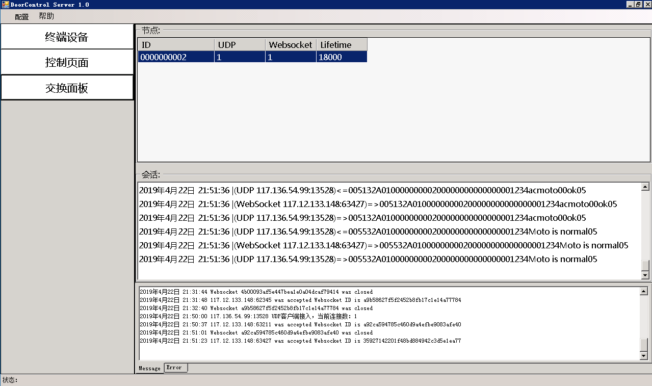 启动方法:在本地windows环境下运行.\UdpPlugWebsocket\bin\Debug\UdpPlugWebsocket.exe即可按照config.xml中描述的端口启动服务程序。默认UDP端口为7101,Websocket端口为9000。此时外部的UDP连接和Websocket连接都会在UI中显示。其中UDP在终端设备页面中显示,Websocket连接在控制页面中显示,通讯状况在交换面板页面中显示。您可以通过配置->显示调试系信息 打开或关闭UI的通讯Log。